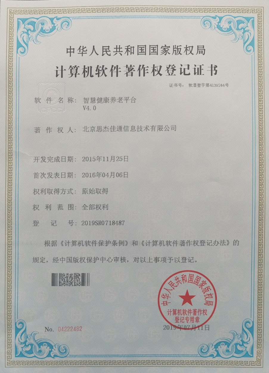 八、具有多項(xiàng)核心的養(yǎng)老平臺(tái)計(jì)算機(jī)軟件知識(shí)產(chǎn)權(quán)證書